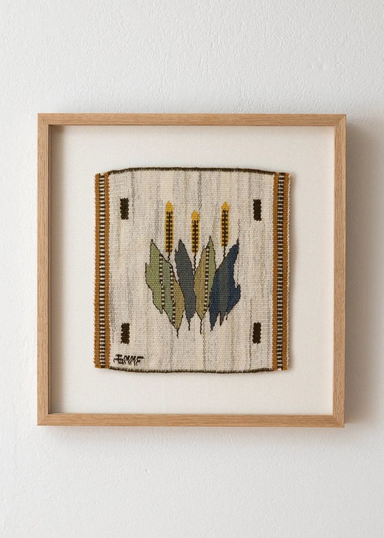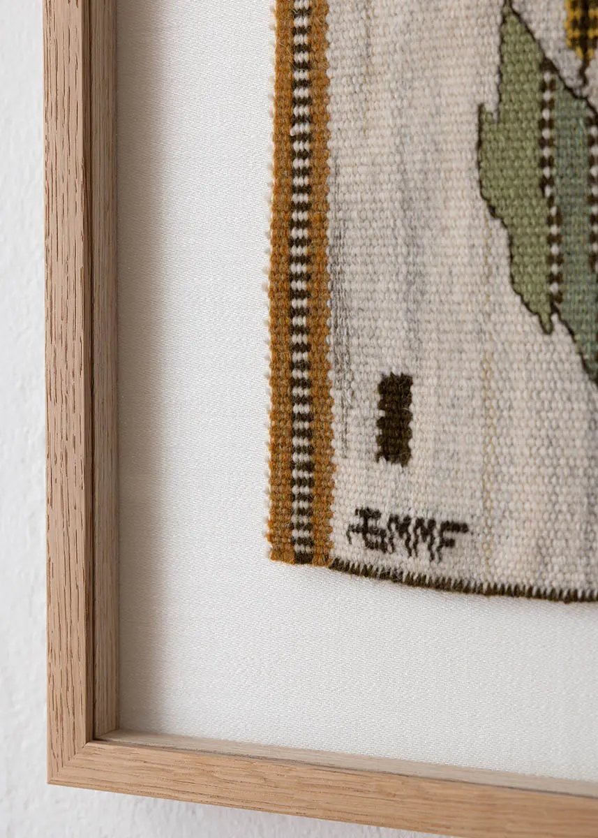 The tapestry is framed in a solid oak frame with art glass and a backing of linen fabric woven locally in Båstad. It comes with a certificate of authenticity from Märta Måås-Fjetterström AB and is currently on display at our Båstad studio and showroom.