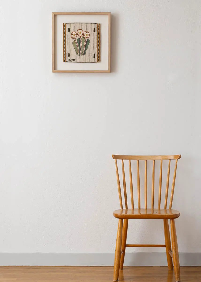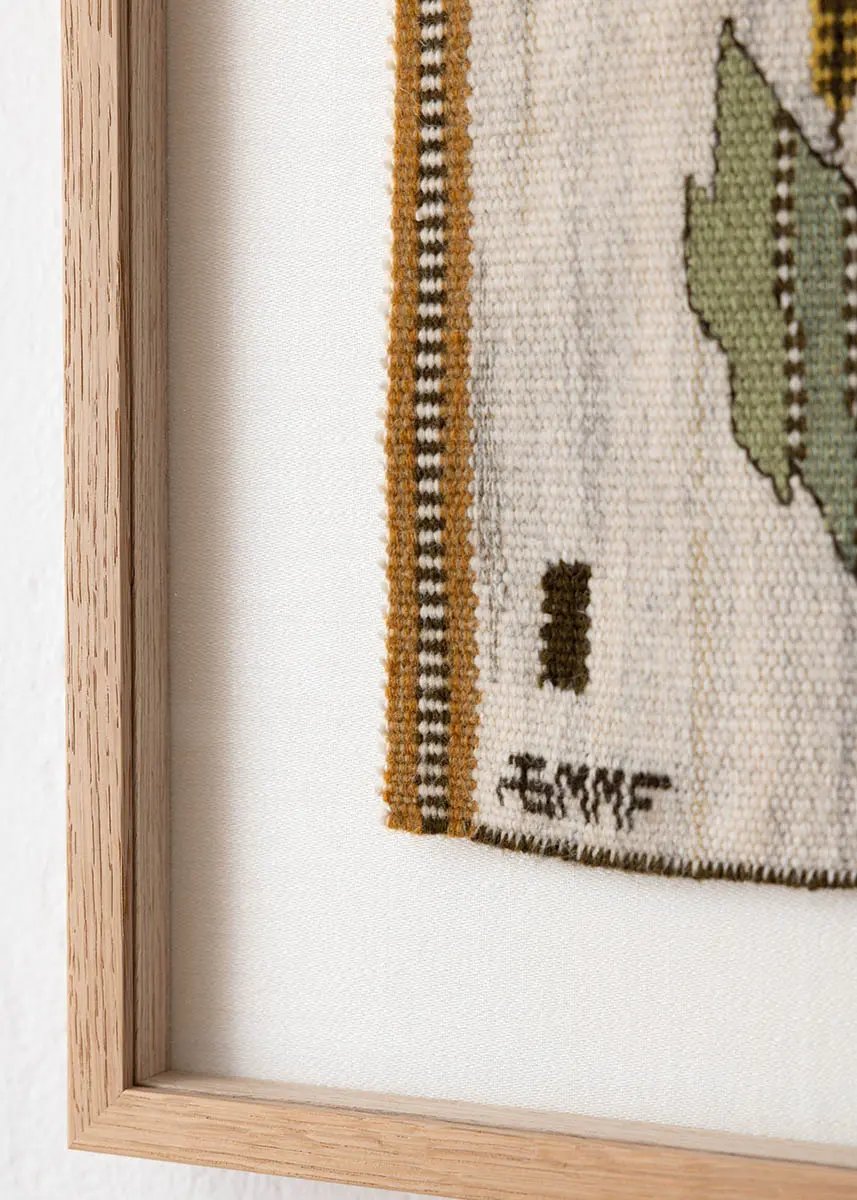 The tapestry is framed in a solid oak frame with art glass and a backing of linen fabric woven locally in Båstad. It comes with a certificate of authenticity from Märta Måås-Fjetterström AB and is currently on display at our Båstad studio and showroom.