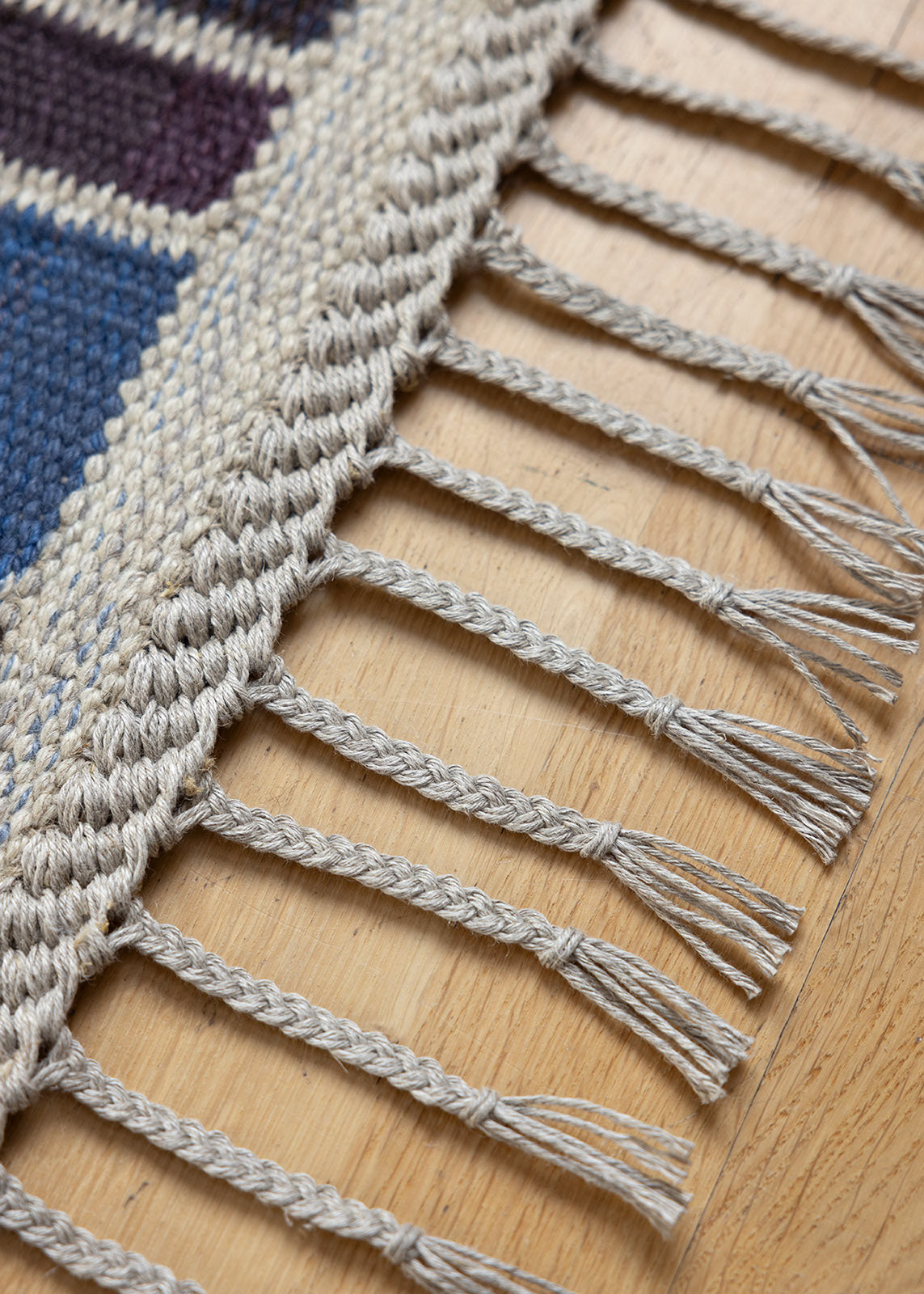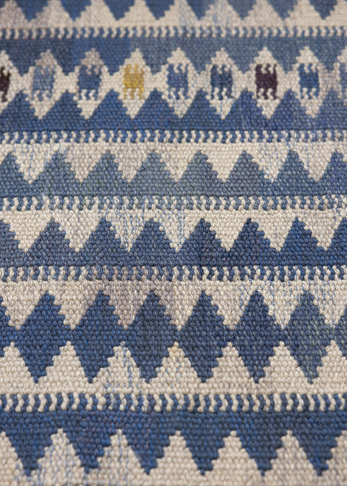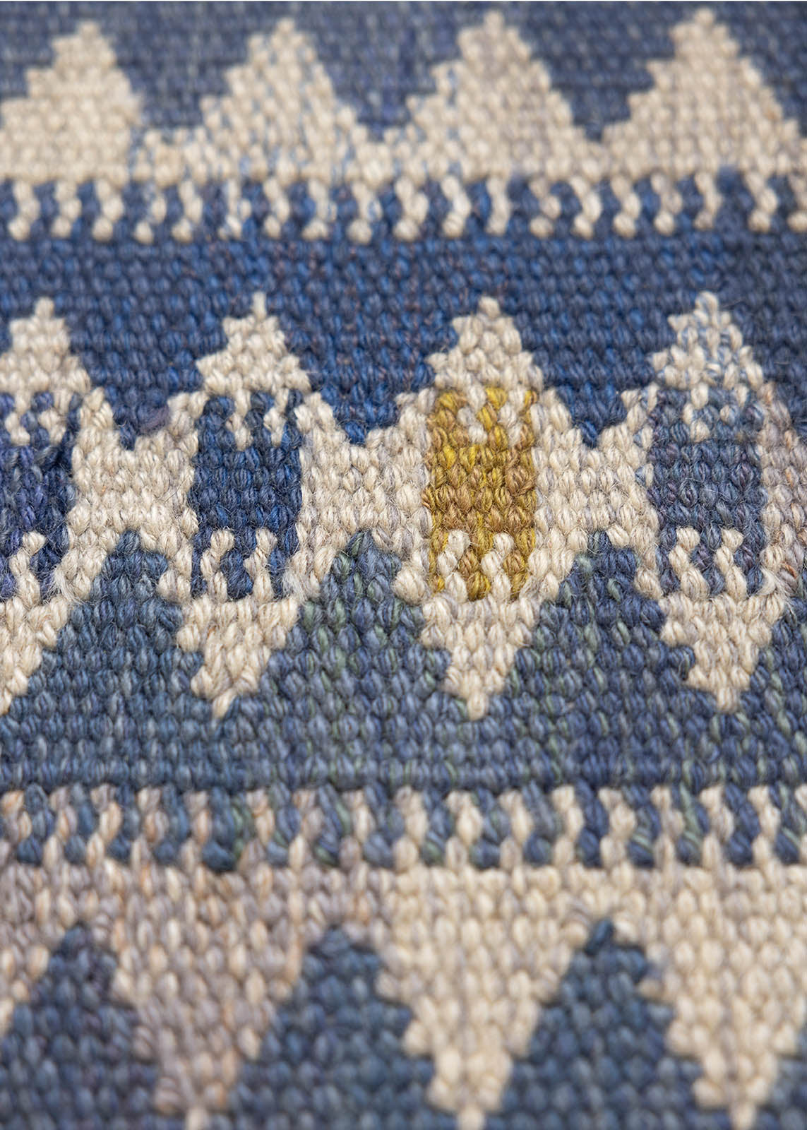 The rug is handwoven in wool on a linen warp. Wool is naturally stain-resistant and should not be washed too frequently, as this can strip the natural oils that protect the fibers.