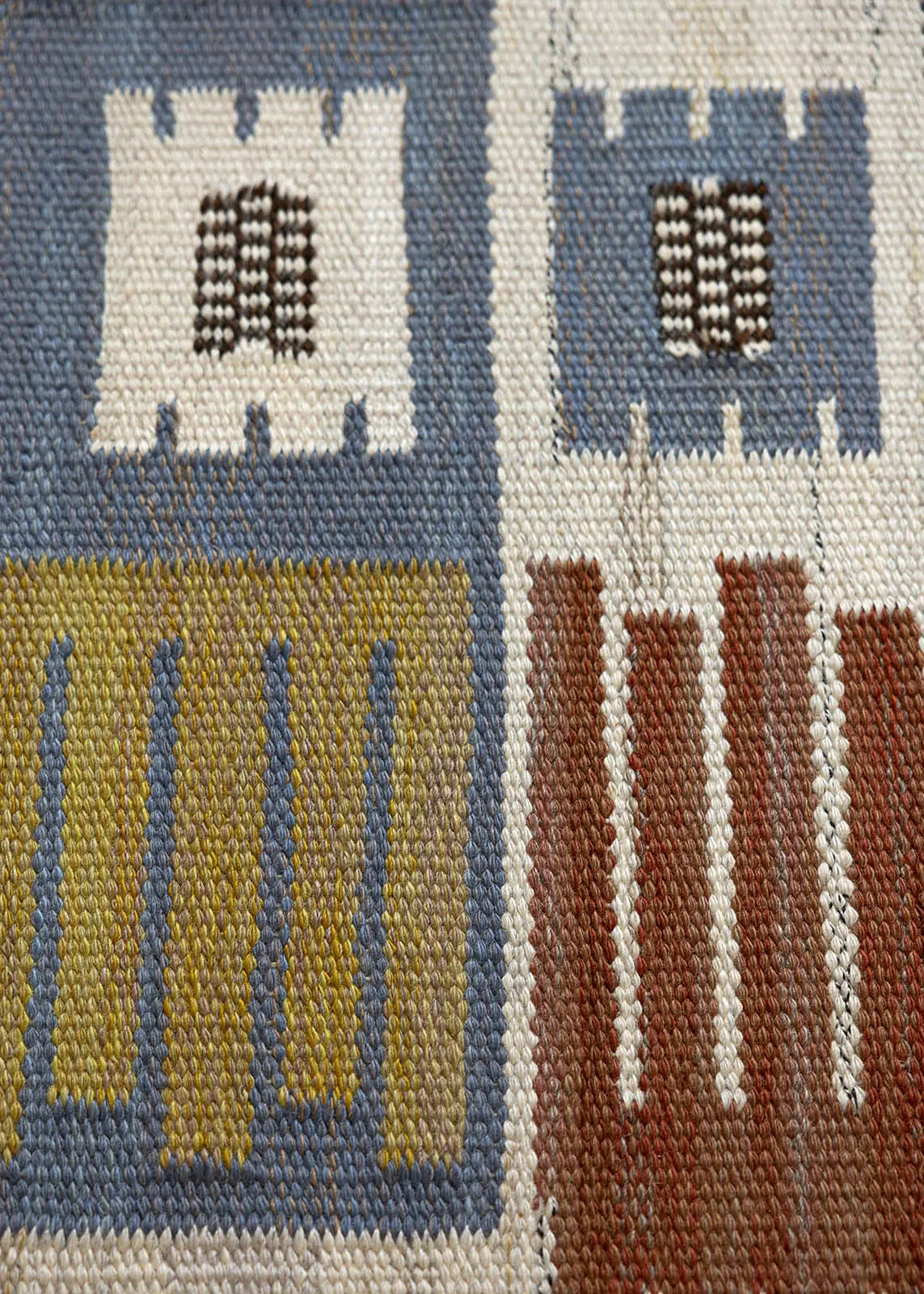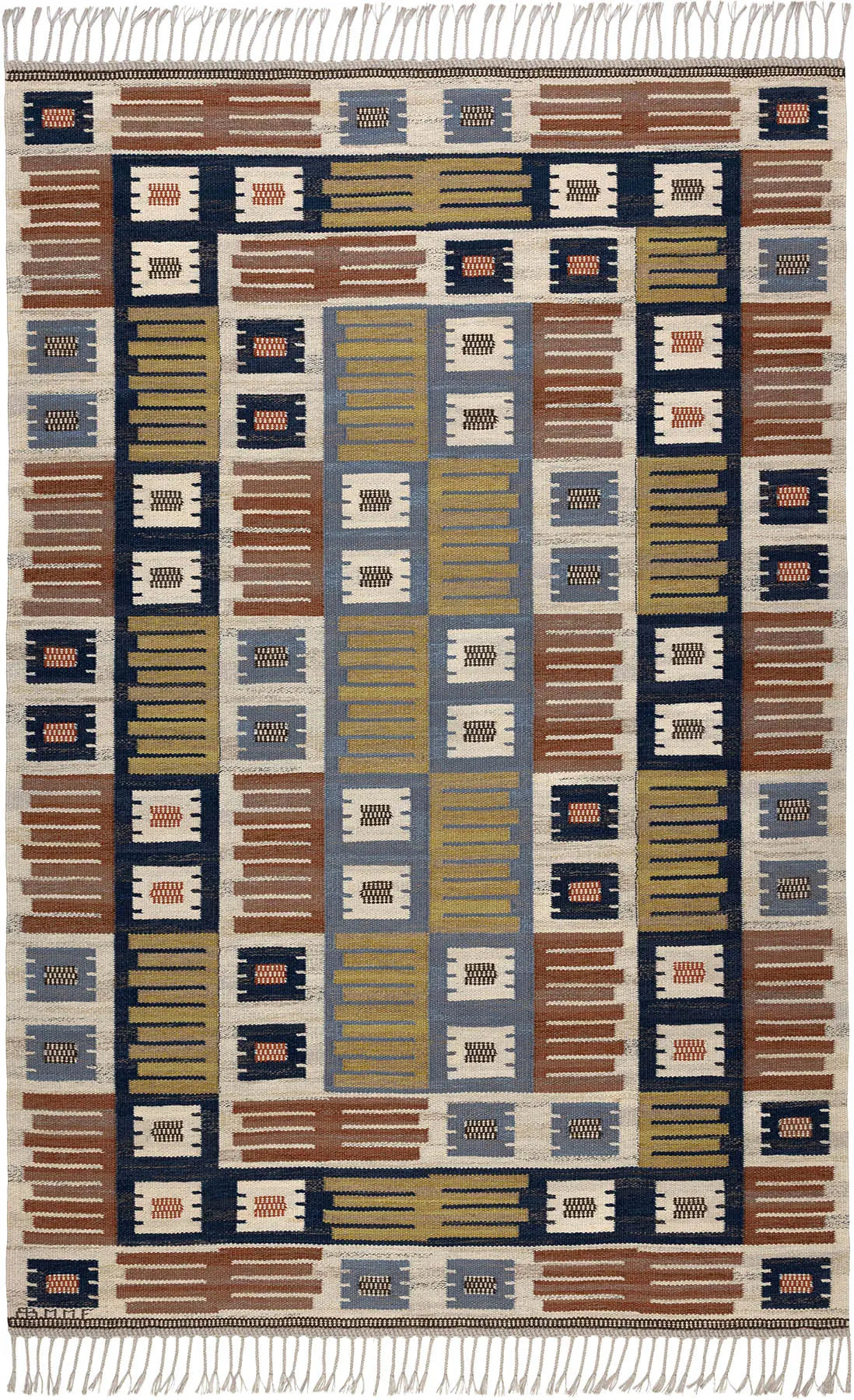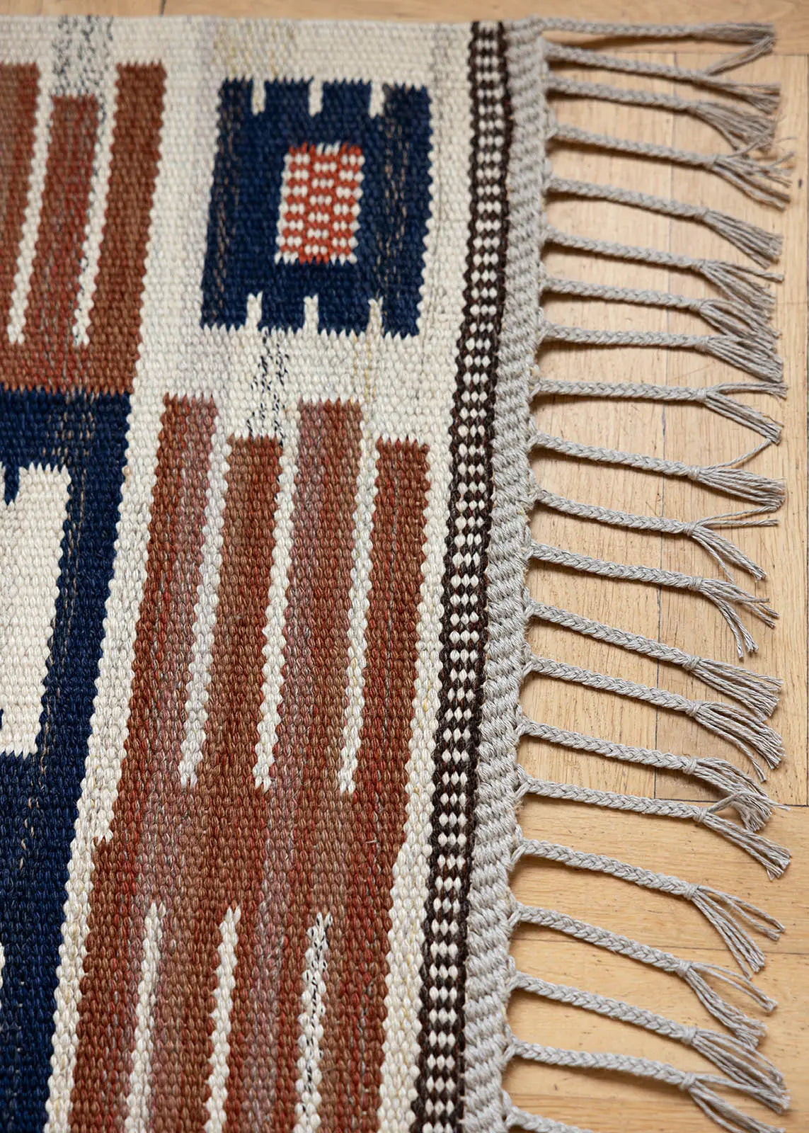 Vintage handwoven rölakan flatweave designed by Märta Måås-Fjetterström in 1932. Handwoven  at Märta Måås-Fjetterström, Båstad, Sweden. Marked AB MMF.