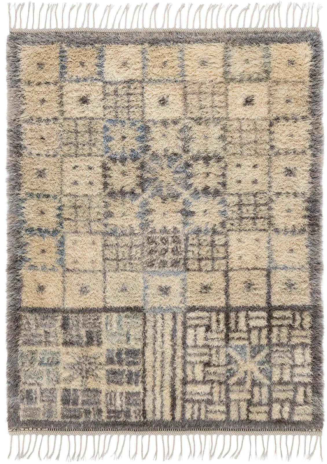 Vintage knotted rya rug designed by Ulla Marianne Richter in 1959. Handwoven at Märta Måås-Fjetterström AB, Båstad, Sweden by Ingrid Ljunggren. Marked AB MMF and MR (artist’s initials).